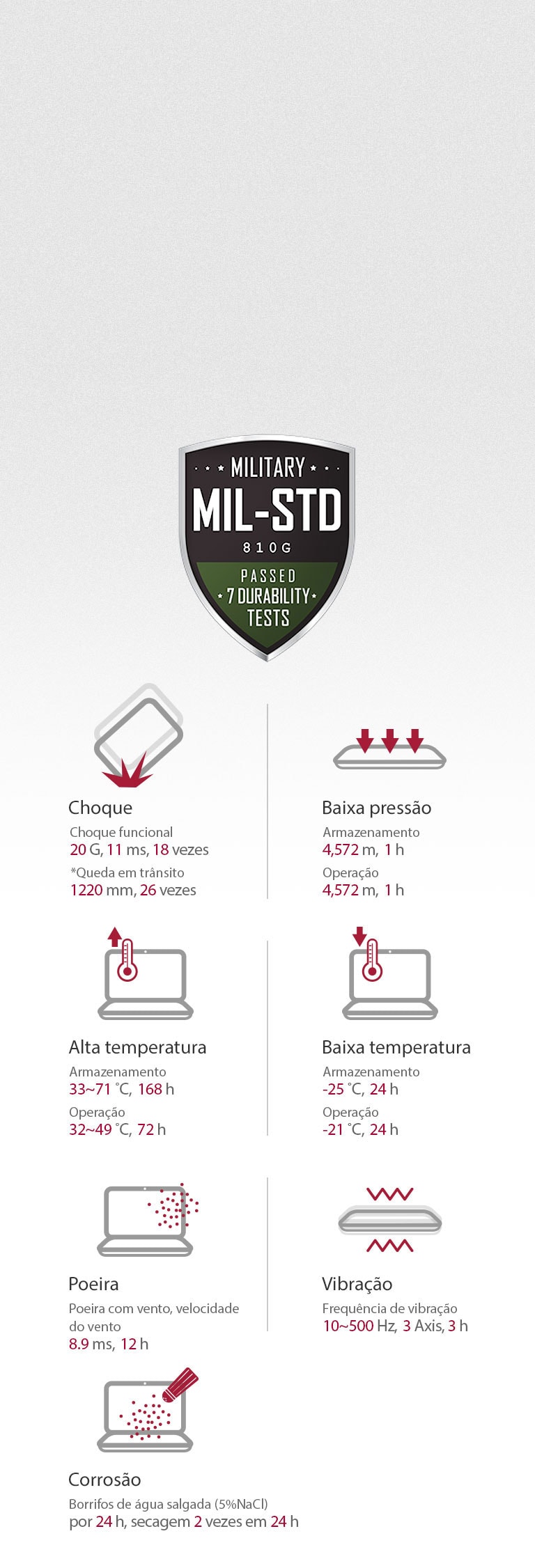 - Aprovado em 7 testes de Durabilidade pelo Departamento de Defesa dos EUA, MIL-STD 810G