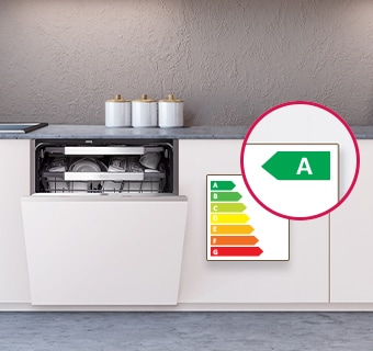 Lavastoviglie con la porta semi aperta e un bollo che indica la classe di efficienza energetica A.