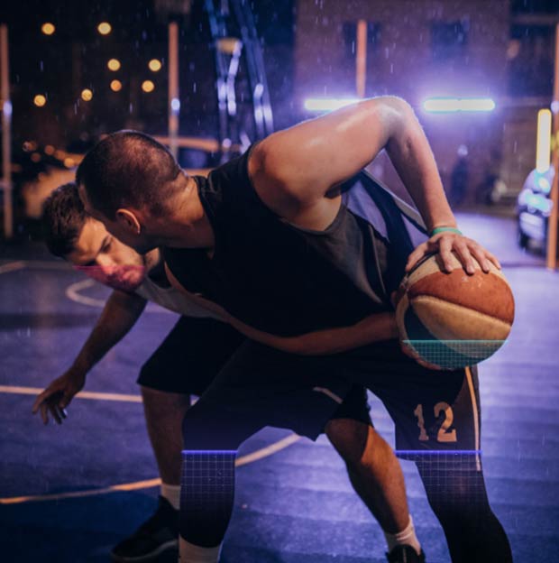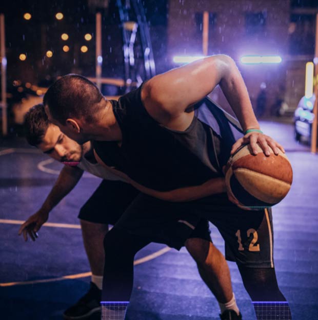 The bodies of 2 men playing basketball are scanned and then appear more boldly.