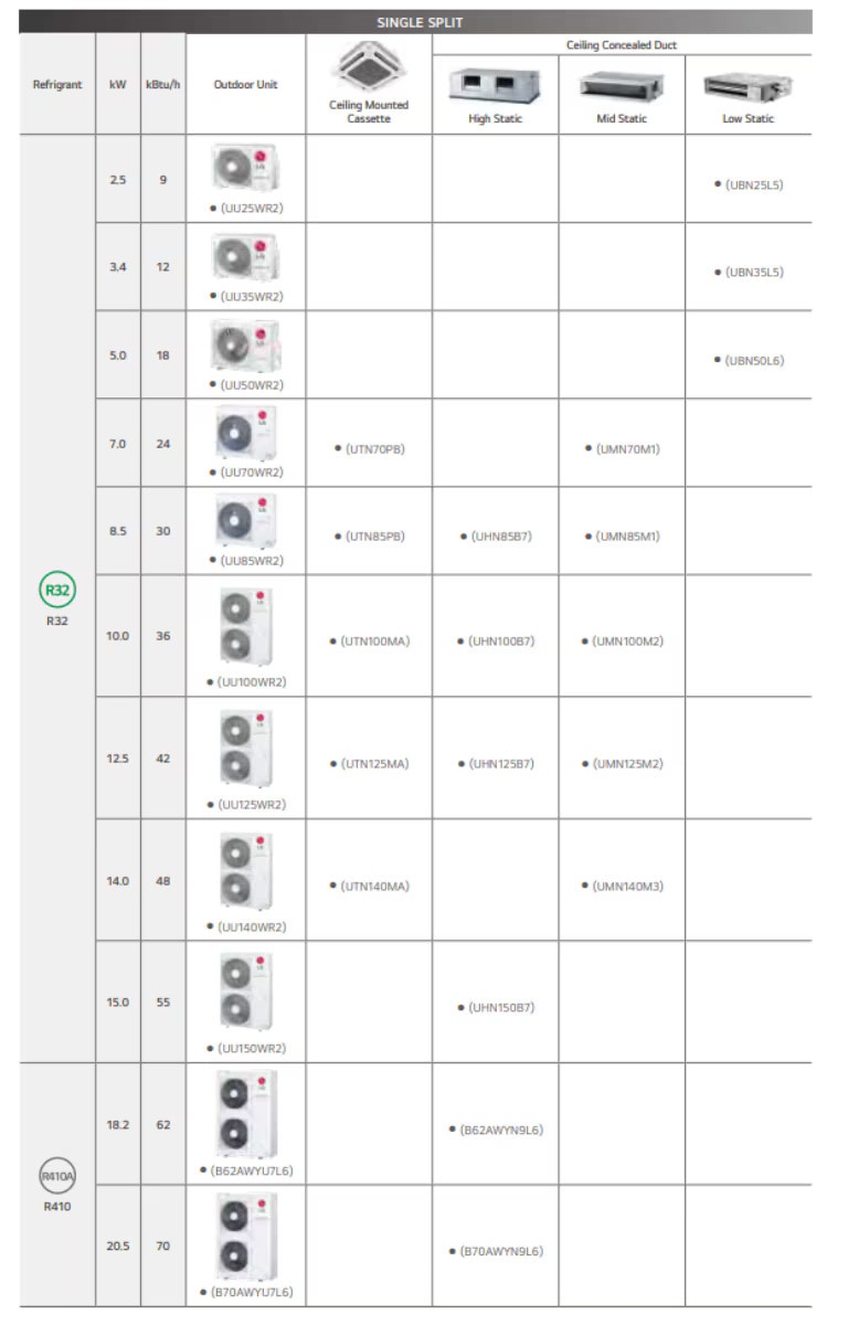The LG Single Split System Ceiling Concealed Duct models are available in high, mid and low static varieties. The LG high and mid static ducted unit is also equipped with Auto External Static Pressure and Zone Control (on/off) to control airflow in each zone, ideal for environments where different temperatures are required.