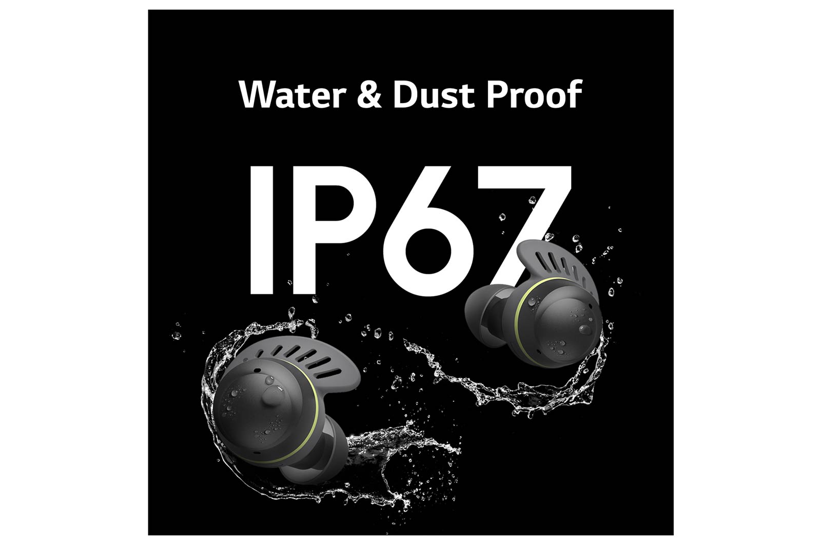 TONE Free fit earbuds in front of text saying IP67. The earbuds are surrounded by water and water droplets.