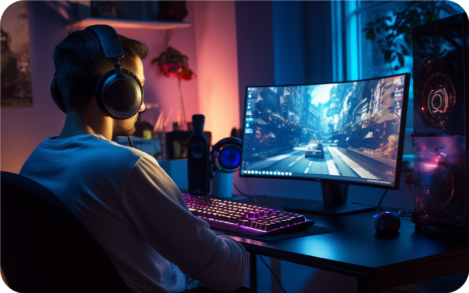 L'homme avec des écouteurs se concentre sur la lecture d'un jeu vidéo sur son moniteur PC 4k, immergé dans l'expérience de jeu.