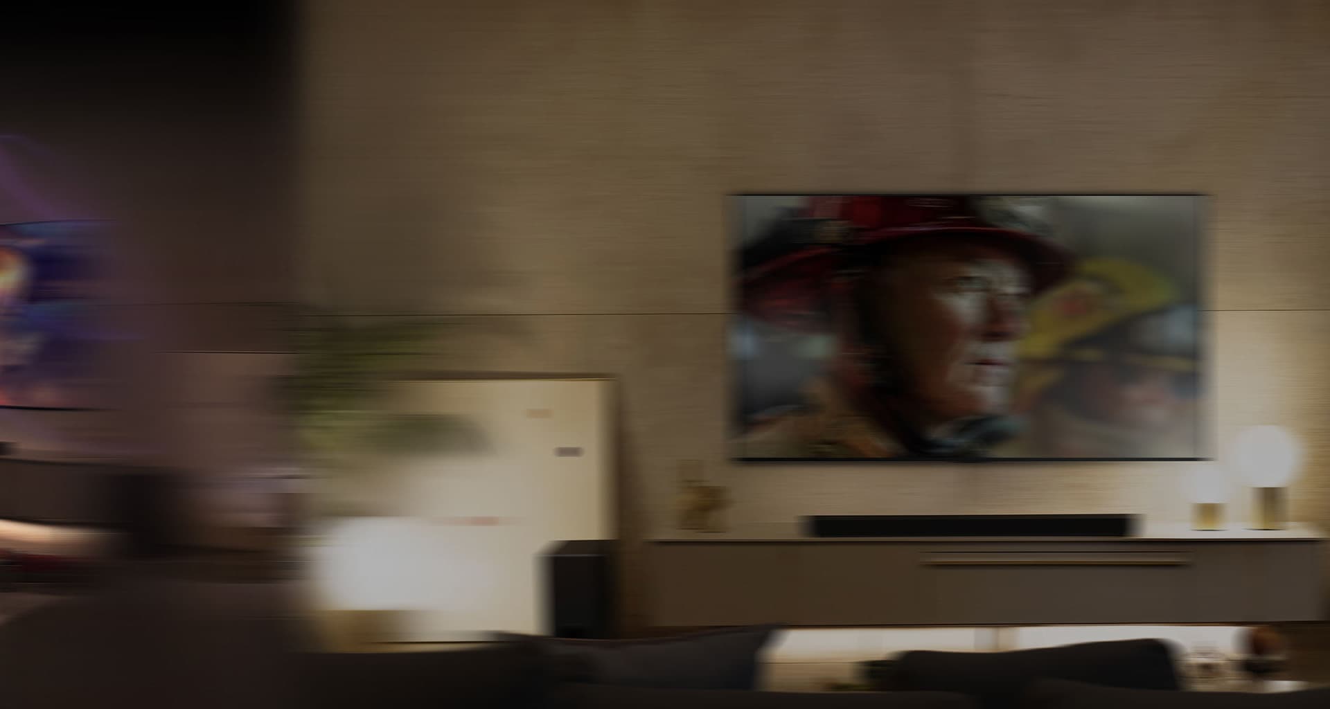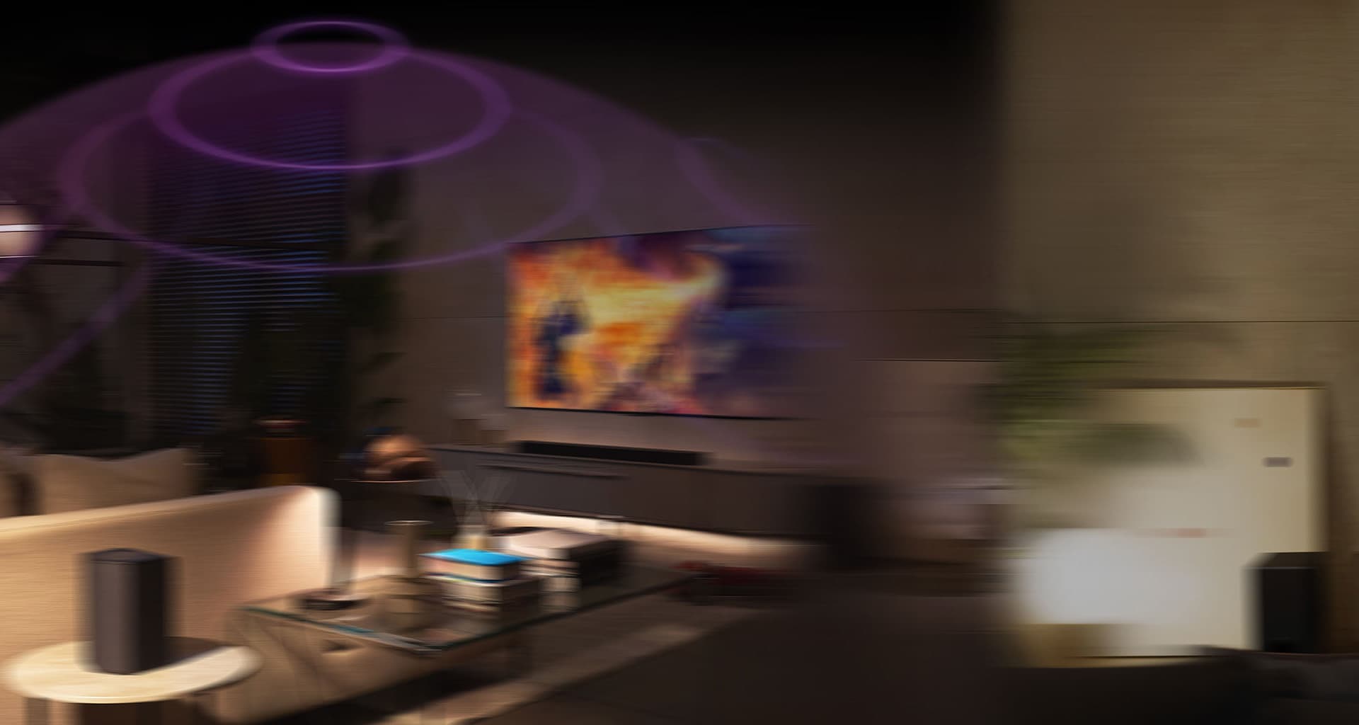 LG OLED телевизор е в уютна всекидневна стая през нощта. Докато филмът се възпроизвежда, се появяват мехурчета, изобразяващи съраунд.
