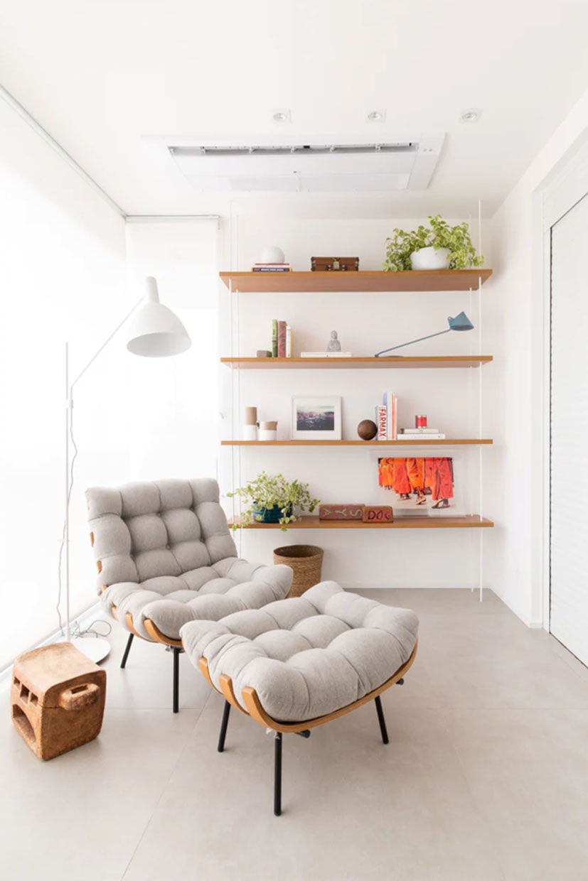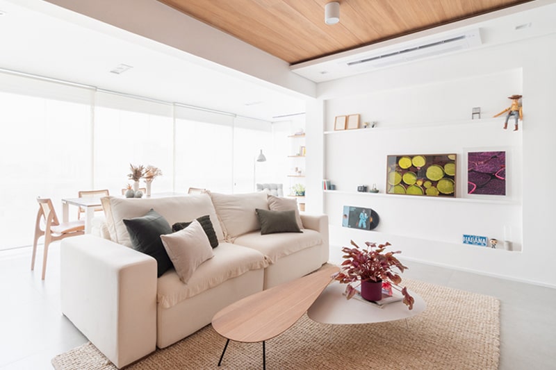 Neste charmoso apartamento localizado em São Paulo (SP), a área social foi especialmente pensada pela arquiteta Luiza Andrade, do escritório Entre Studio. O imóvel que totaliza 100 metros quadrados se destaca pelos tons neutros, enquanto a textura da madeira inspira o aconchego na rotina dos clientes. O conceito minimalista e contemporâneo ganha a cena a partir do mobiliário clean, das linhas retas e do toque de cor que surge nos detalhes.