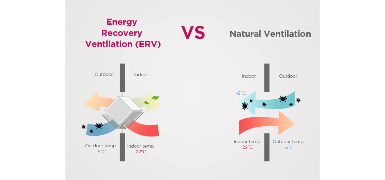 O ERV funciona em conjunto com outros dispositivos, como as unidades de ar condicionado, para superar transições abruptas entre temperaturas extremas. Com estas funções e com o intertravamento do ERV com o sistema de ar condicionado, é possível economizar energia durante o aquecimento/ resfriamento e ventilação do espaço interno.