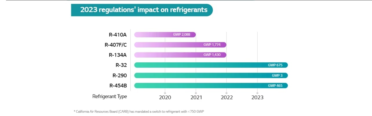 A modificação nas classificações SEER também traz uma mudança para refrigerantes de alta eficiência e baixo GWP (Potencial de Aquecimento Global). Um grande número de refrigerantes HFCF (Hidroclorofluorcarbono) e HFC (Hidrofluorcarbono) com alto GWP foi eliminado nos últimos anos. Em uma tentativa de minimizar o uso de refrigerantes com alto potencial de aquecimento global, refrigerantes HFC como R134a, R410A e R407C terão seu uso proibido nos EUA a partir de 1º de janeiro de 2024 4). Em vez disso, opções mais ecológicas, como R290 ou R-454b.