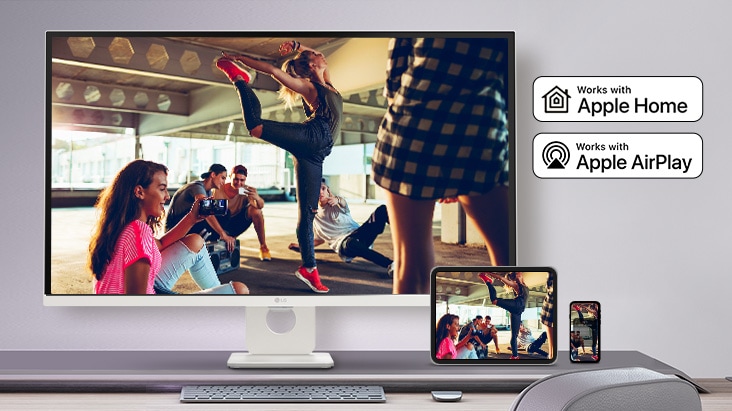 Compartilhe o conteúdo do seu smartphone para o seu monitor com AirPlay 2* (para dispositivos Apple) ou Screen Share** (para dispositivos Android). Aproveite também um som envolvente com a conexão Bluetooth. O modelo também conta com Built-in WiFi.