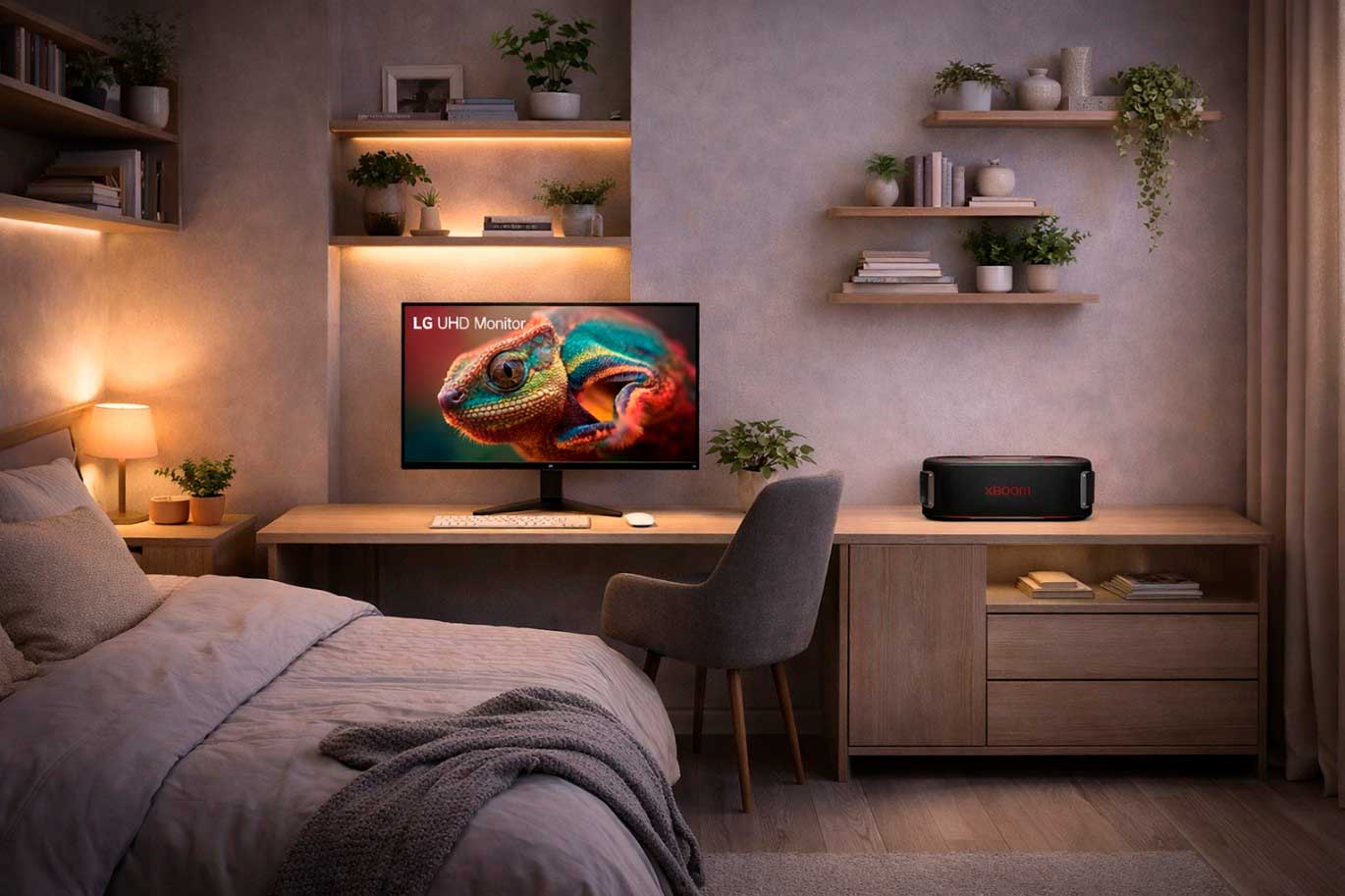Para criar uma experiência sonora mais agradável sem complicar o ambiente, caixas de som compactas são uma boa solução. Por exemplo, a LG xboom Bounce combina com quartos multifuncionais por oferecer som com mais presença do que o áudio do notebook ou do celular, sem exigir instalação.