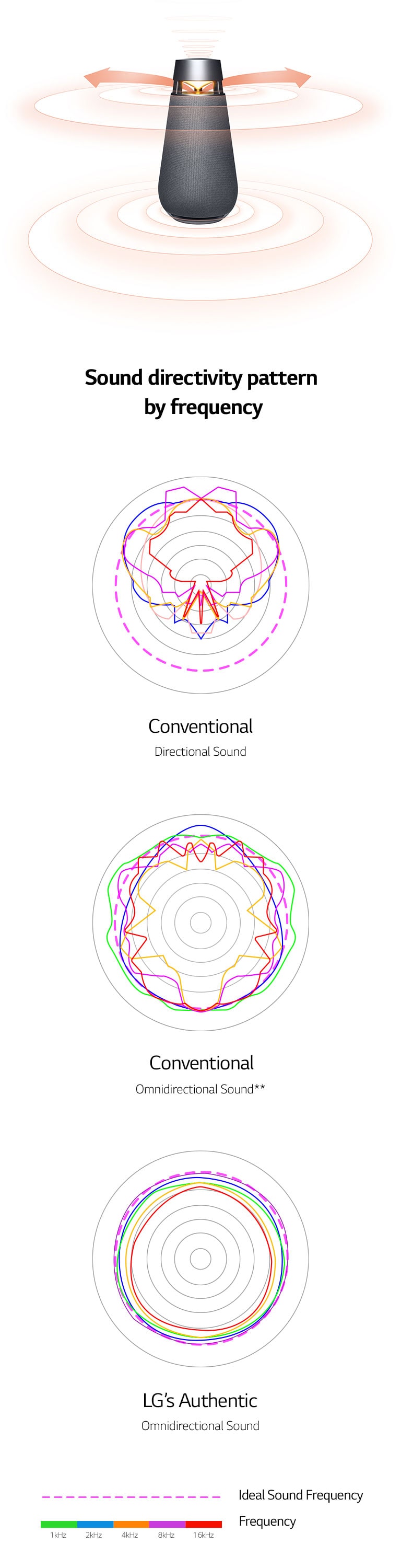 An image that compares the sound wavelengths of conventional directional sound and conventional omnidirectional sound with the sound wavelengths of LG's Authentic omnidirectional sound.