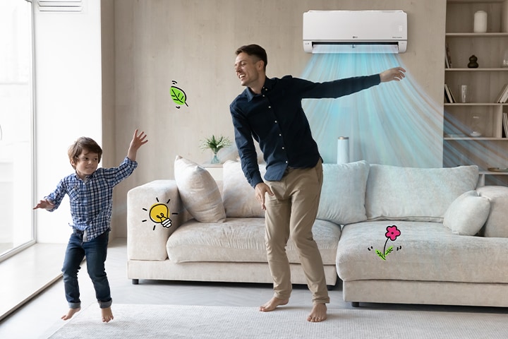 Le climatiseur est activé derrière un père et un fils heureux, et on aperçoit des ampoules et des feuilles qui représentent l’énergie autour d’eux.