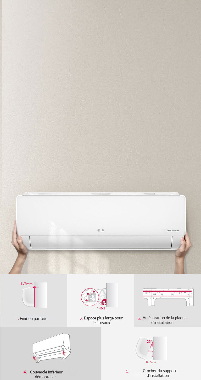Les climatiseurs de LG sont conçus pour être installés facilement et efficacement. En réduisant la main-d'œuvre et le temps nécessaires à l'installation, il est possible d'installer plus de climatiseurs dans plus de maisons, et ce, plus rapidement.