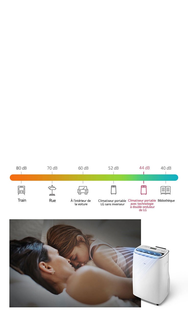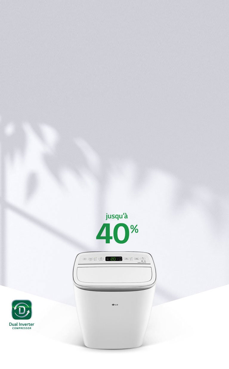 *La technologie à onduleur est une caractéristique clé des climatiseurs portables à onduleur de LG. Elle est utilisée conjointement avec un compresseur à vitesse variable et règle la vitesse du moteur du compresseur pour réguler la température. Ce système est plus écoénergétique que les climatiseurs portables non dotés de la technologie à onduleur, qui allument ou éteignent le compresseur pour réguler la température. Les tests montrent que le climatiseur portable à onduleur de LG (LP1419IVSM) permet d’économiser jusqu’à 40% plus d’énergie que le climatiseur portable sans onduleur de LG (LP1417GSR).