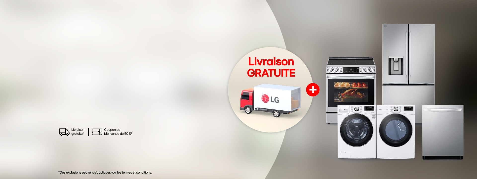 ³À la date de livraison, LG accepte de ramasser les vieux électroménagers du membre de LG sans frais supplémentaires (à l’exception des téléviseurs, des micro-ondes, des aspirateurs, des électroménagers commerciaux, des réfrigérateurs d’une largeur supérieure à 36 pouces et des accessoires). Pour bénéficier de ce service, l’ancien électroménager doit être du même type et se trouver au même endroit que le nouvel appareil livré. L’ancien électroménager doit être vide et ne plus être raccordé aux branchements d’électricité, de gaz et/ou d’eau. Aucun obstacle ne doit se trouver sur le chemin du retrait, y compris, mais sans s’y limiter, des meubles, des portes ou des escaliers étroits, des jouets, des animaux de compagnie, de la neige, de la glace, etc. LG peut, à sa seule discrétion, refuser de livrer et/ou de ramasser votre électroménager si elle juge que les conditions sont trop dangereuses. Pour obtenir de plus amples renseignements, cliquez sur nos Conditions générales d’achat. Les services offerts sont susceptibles d’être modifiés sans préavis.
