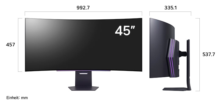 Das 45-Zoll-Display bietet ein unglaublich großartiges und angenehmes Seherlebnis. Die nutzbare Displayfläche von 45 Zoll im 21:9-Format ist 12 % größer als die von 49 Zoll im 32:9-Format und hat ein perfekt proportioniertes Verhältnis von vertikaler und horizontaler Richtung, sodass die Spieler alle Details auf einen Blick erfassen können. Außerdem ist das 21:9-Bildseitenverhältnis die ideale Option für Gamer, da die meisten Spiele das 21:9-Bildseitenverhältnis besser unterstützen als das 32:9-Bildseitenverhältnis.