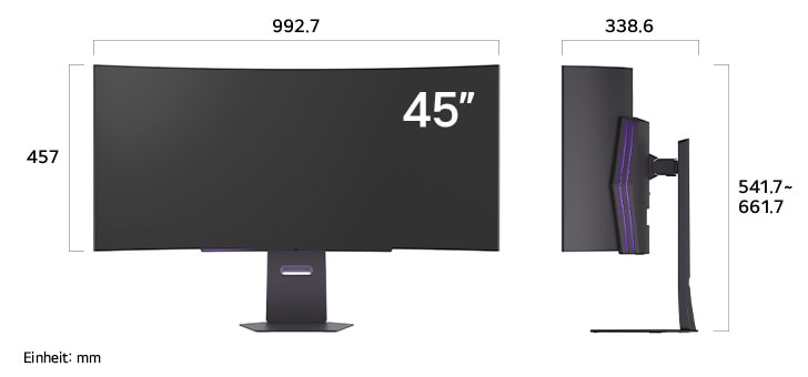 Das 45-Zoll-WQHD-Display (3440 x 1440) bietet einen um 34 % größeren Sichtwinkel als standardmäßige 16:9-Bildschirme und liefert scharfe und klare Bilder. Dieser WQHD OLED macht beim Gaming in jeder Umgebung dunklere Schatten, hellere Lichter und lebendigere Farben sichtbar.