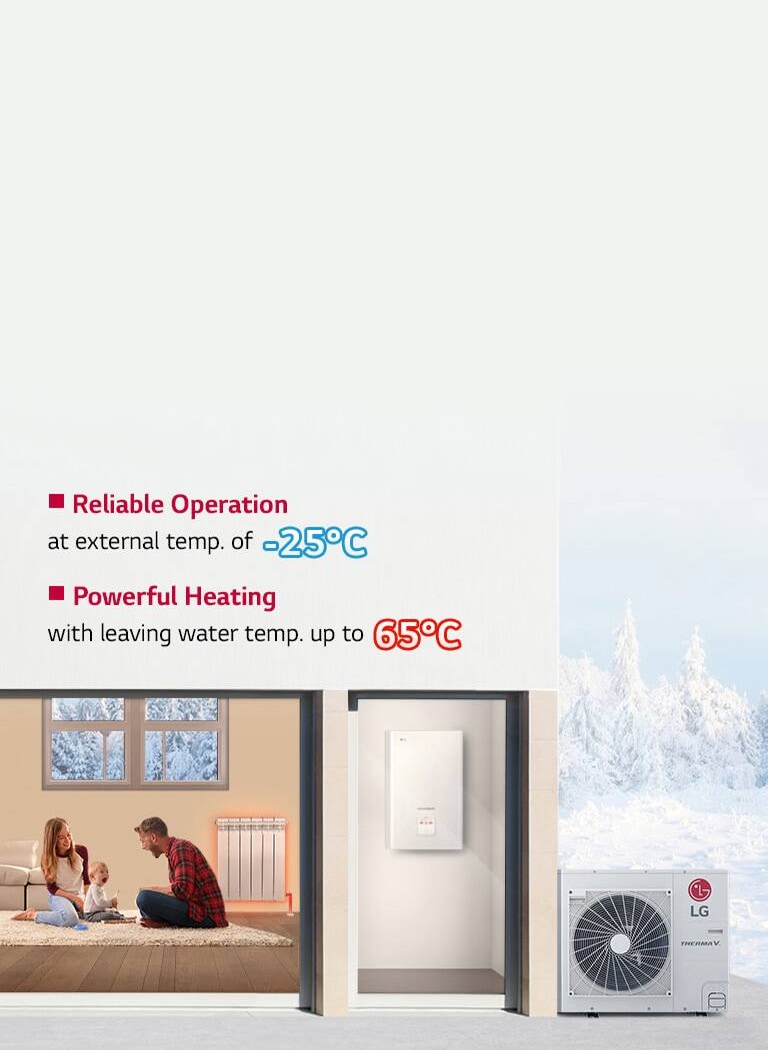 LG THERMA V R32 split offers a powerful heating solution for indoor spaces. It can operate at extremely cold weather like -25℃ and heat water up to 65℃.