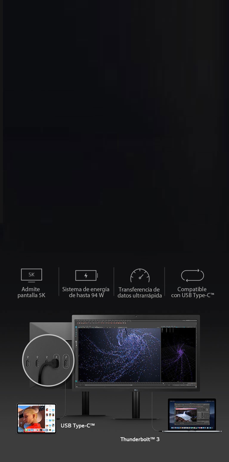 - Thunderbolt 3™, que permite conectividad universal, ahorro de espacio, las mejores velocidades de transferencia de datos; y hasta 94W de potencia de carga.