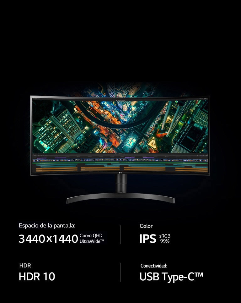LG 34WN80C - Monitor Ultrapanoramico 21:9 LG UltraWide (Panel IPS: 3440x1440, 300cd/m², 1000:1, sRGB>99%, curvo); diag. 86,72cm; entr.: HDMIx2, DPx1, USB-Cx1, USB-Ax2; ajust. en altura e inclinación.