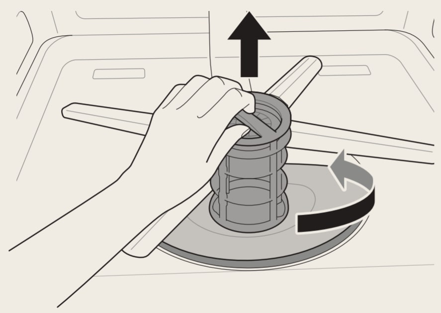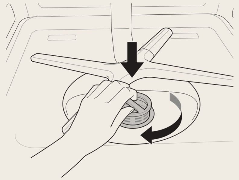 4. Para volver a colocar los filtros montados, coloque el brazo de pulverización de forma que quede un espacio en forma de V mayor hacia la parte delantera. Vuelva a colocar los filtros en el soporte para filtros y gire el filtro interior hacia la derecha hasta que quede colocado correctamente.
