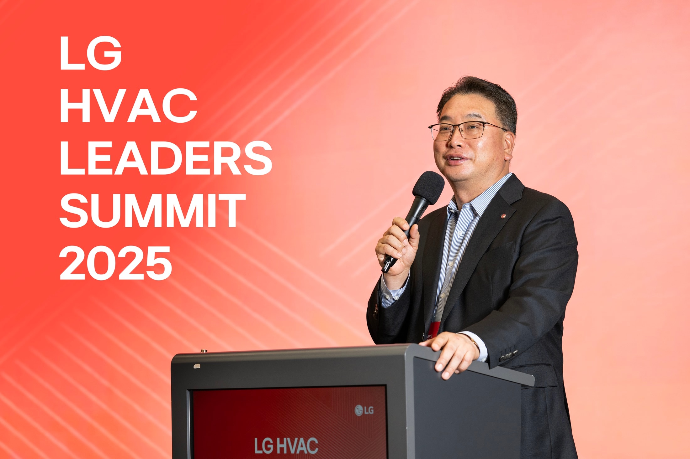 Business professional delivering a speech at the LG HVAC Leaders Summit 2025 with a red event backdrop.