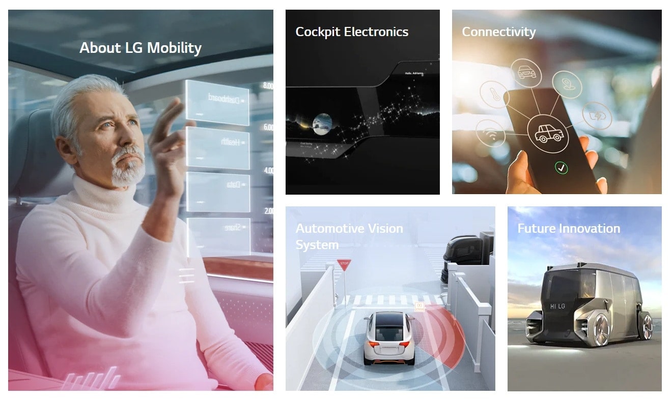 Upon entering the site, visitors are presented with four main menus – Cockpit Electronics, Connectivity, Automotive Vision System (AVS) and Future Innovation – in which LG’s main technological strengths in mobility are highlighted. Cockpit Electronics includes LG’s automotive display and cockpit domain controller innovations, Connectivity covers telematics and wireless charging, AVS includes information on vehicle cameras and Future Innovation focuses primarily on the digital cockpit.