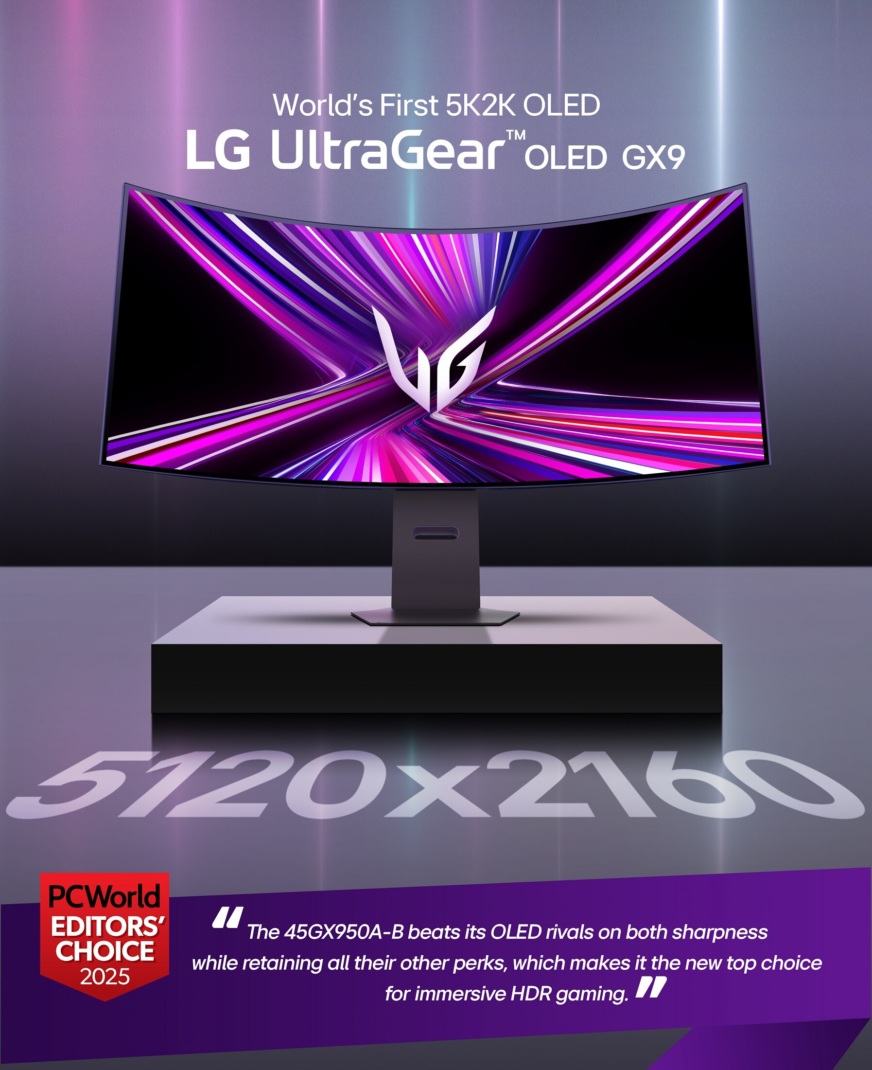 The LG UltraGear OLED Gaming Monitor GX9 (45GX950A) is built for immersion on a whole new scale. With world-first 45-inch 5K2K (5120×2160) screen* and dramatic 800R curvature, it surrounds gamers with an incredible field of view. Its Dual-Mode feature offers the versatility to switch between the breathtaking detail of 5K2K at 165Hz for graphic-rich worlds and the blistering speed of WFHD at 330Hz for competitive action. For creators, that same 21:9 screen provides 50 percent more space than a standard 32:9 monitor, while its 125 PPI ensures razor-sharp text clarity. With 98.5 percent DCI-P3 color coverage and DisplayHDR™ True Black 400 certification, it delivers the cinematic color and deep blacks needed for high-fidelity creative work – making it a massive digital canvas perfect for laying out long video timelines or managing multiple applications.