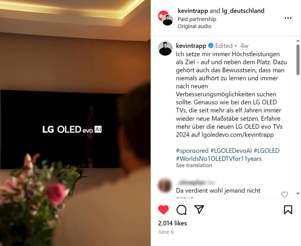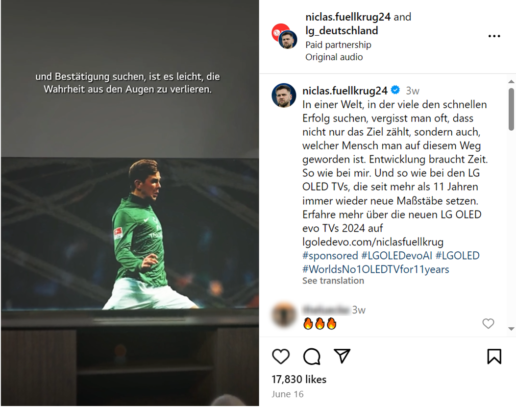 Niclas Füllkrug not only enjoys watching the big game on his LG OLED evo TV but also entertains thousands of football fans sitting at home in front of their TV by scoring crucial goals for club and country, like his stoppage-time equalizer against Switzerland in the group stage. LG Germany is proud to work with exceptional footballers both on and off the pitch, celebrating the joy football brings to billions of people around the world during the European Football Championship.