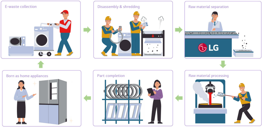 LG has implemented a resource circulation program that now spans 52 countries, with the LG Recycling Center in South Korea playing a central role. Raw materials such as iron, copper, aluminum and plastic are extracted from old home appliances, then sorted and processed before ultimately being ârebornâ as new lifestyle appliances, such as the LG Styler⢠ShoeCase and ShoeCare, LG PuriCare⢠AeroFurniture and LG tiiun mini.