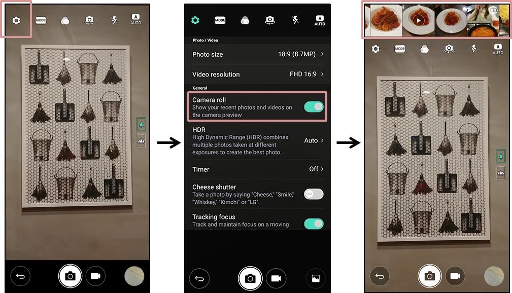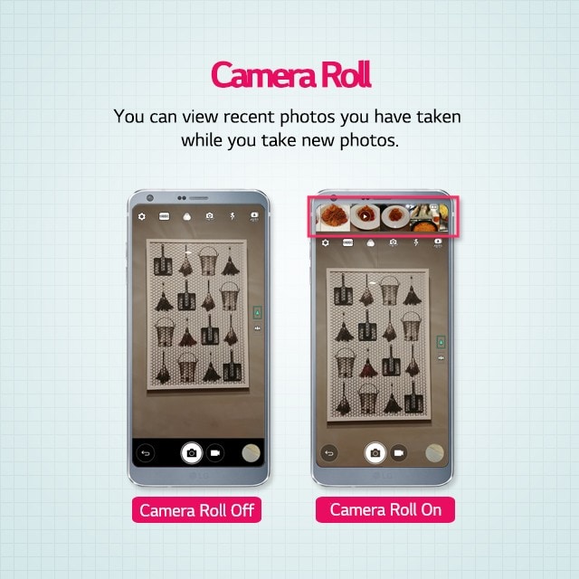 The standard shooting mode of the LG G6 shows photos that take up the entire FullVision display. But if you activate camera roll on the camera app, thumbnails of shots appear along the edge of the screen in a filmstrip view whether the G6 is held vertically or horizontally. Tapping on a thumbnail enlarges the image for immediate sharing.
