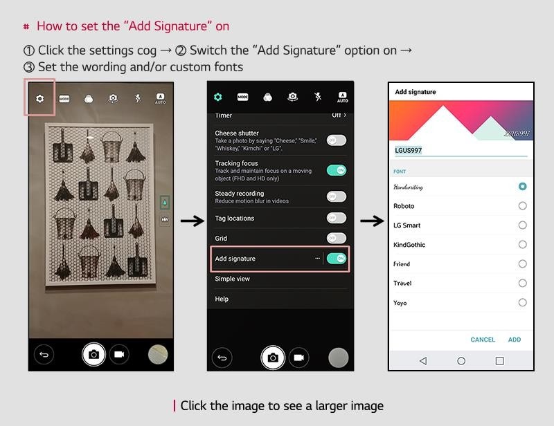With the LG G6, there is no need to manually tag every photo with your signature of ownership. Use the add signature feature to create your own personal signature and custom font which will appear on the bottom right corner of every image you take.