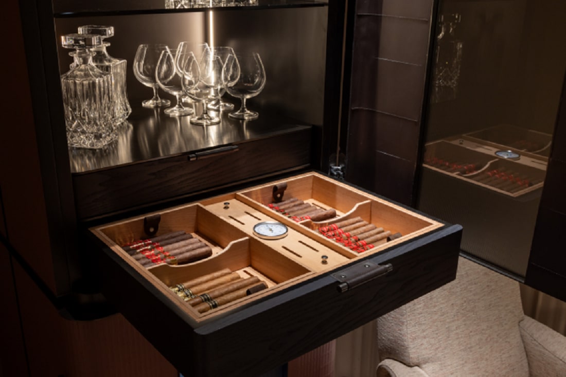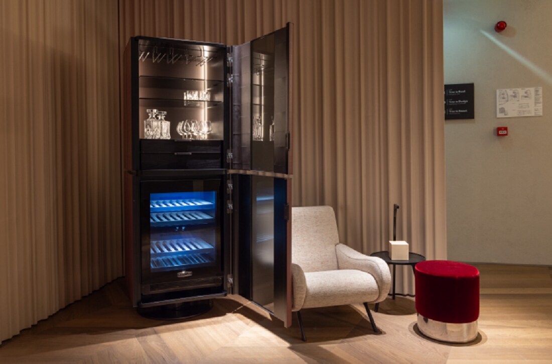 Another aesthetically-unimpeachable appliance that debuted during Salone del Mobile was the Signature Kitchen Suite Wine Cabin. A collaboration between LG and m2atlier, a Milan-based architectural design group, this remarkable piece provides temperature-controlled wine storage in its lower compartment, storage space for wine glasses and bottles in its upper compartment, and a beautiful cigar box in between.