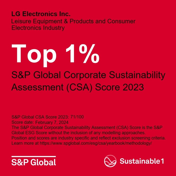 LG received high scores in this year’s assessment, particularly in the areas of environment and governance. In the environmental sector, LG achieved perfect scores in resource circularity, including energy, waste and water management, and scored major points for its systematic climate strategy. On July 18, LG attended the 2023 S&P Global Sustainability Awards Ceremony held in Seoul to accept the highly sought-after accolade in person.