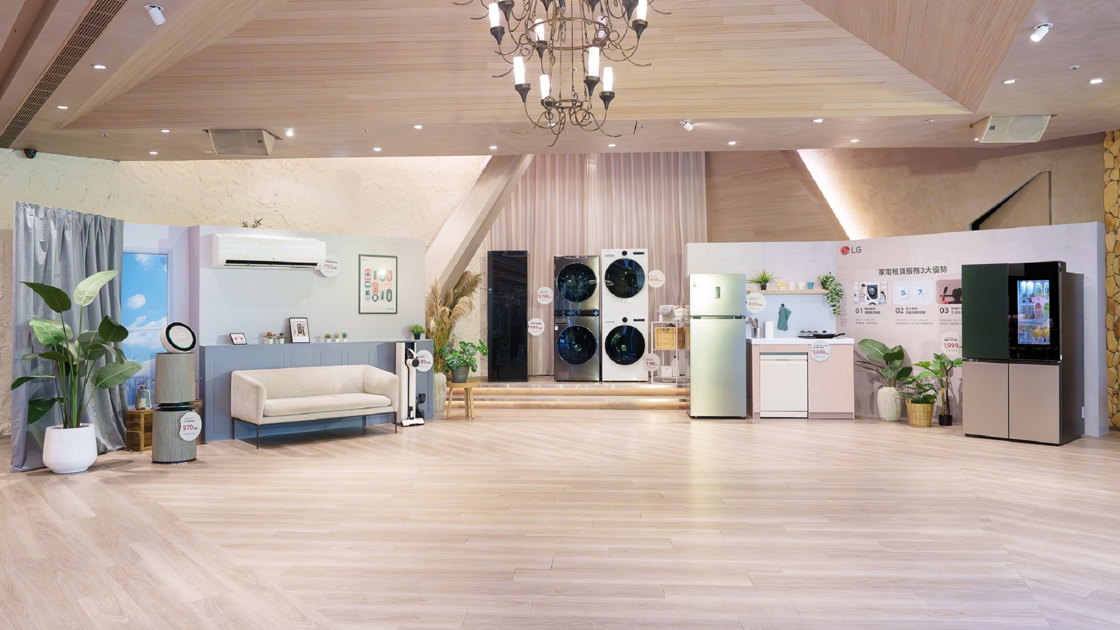 The venue featured a home-like showcase area with themed spaces, including living rooms, kitchens and laundry rooms, demonstrating how renting a full suite of LG appliances can significantly reduce expenses while upgrading daily living experiences.