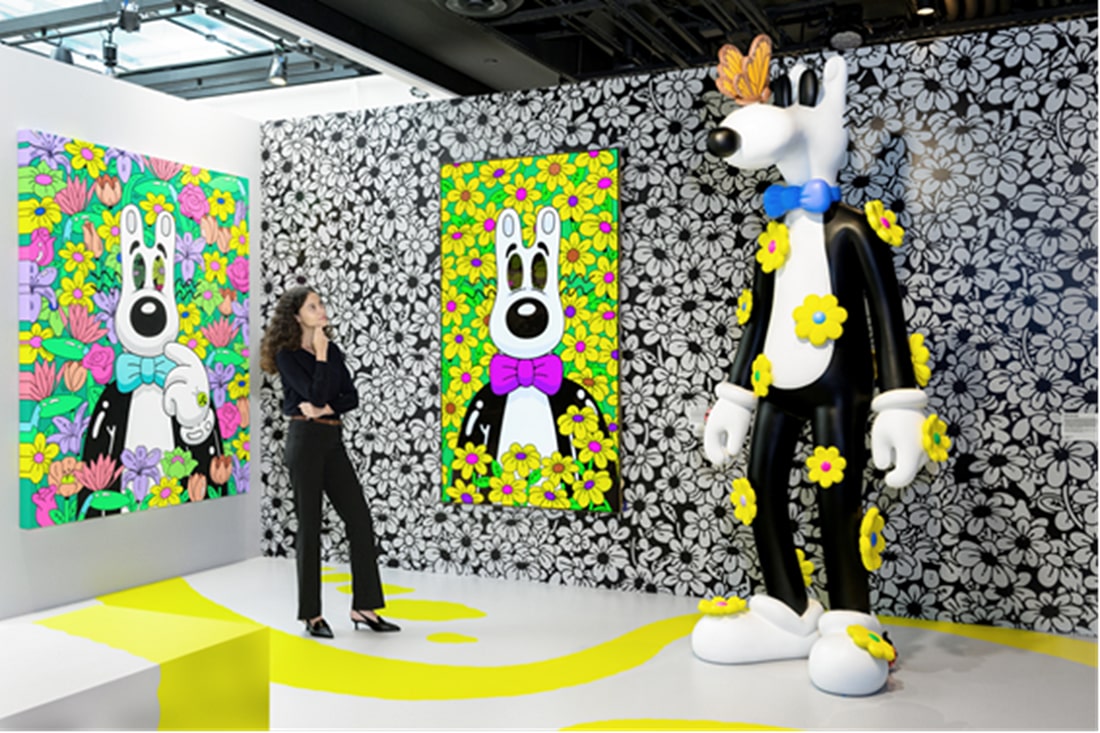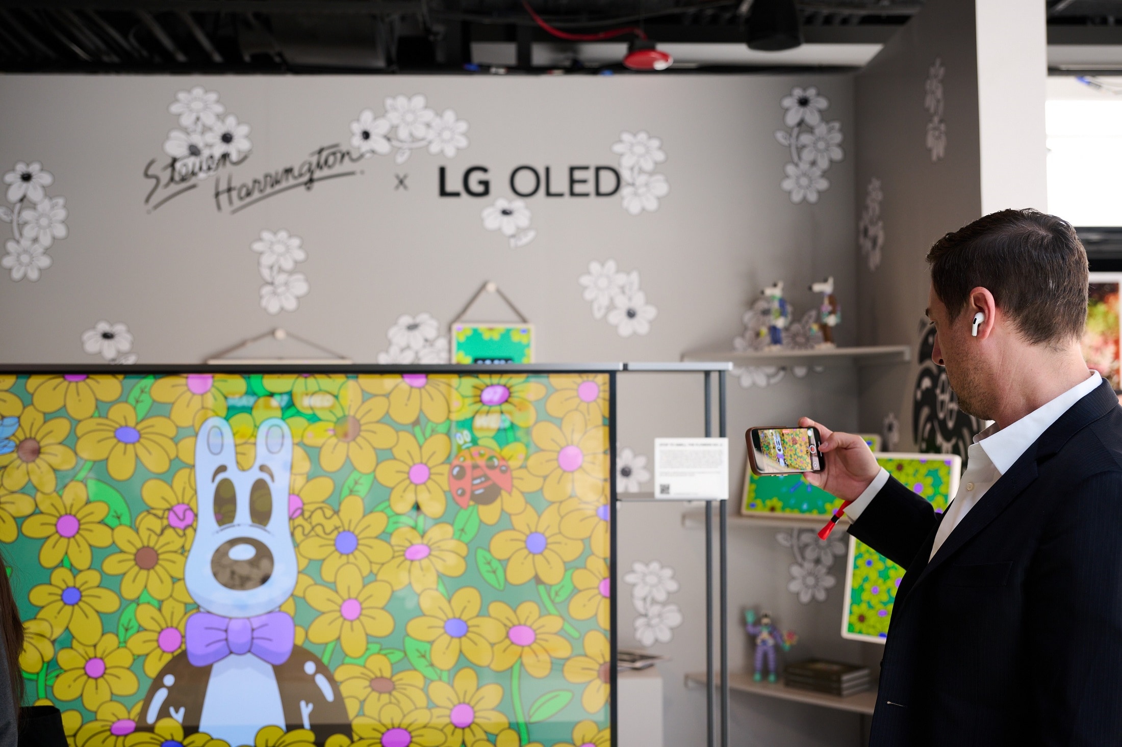 Meanwhile, the LG OLED evo G5 model’s massive 97-inch screen accentuated the bright yellow flowers and lush greens in Harrington’s Stop to Smell the Flowers No. 4, showcasing the brilliant color and impressive contrast of self-lit OLED technology. These vibrant blooms stood out against the countless white flowers scattered across the black wall, drawing attention to the central image of Mello in a purple bowtie.