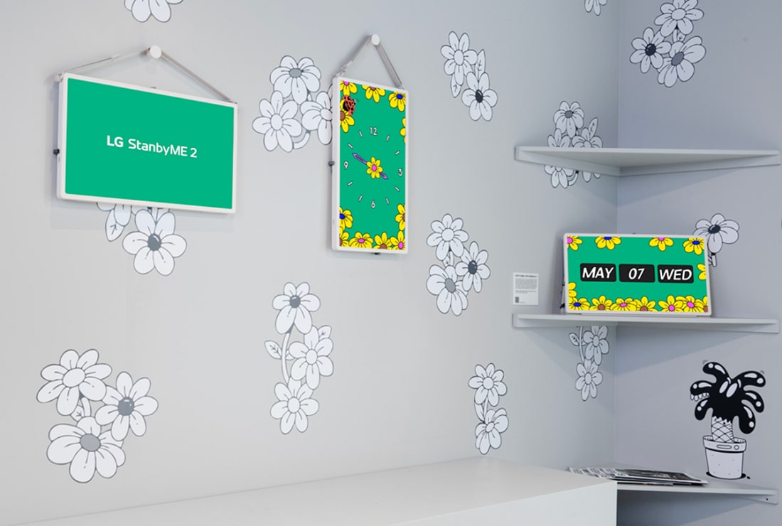 At the exhibition, the StanbyME 2, LG’s latest lifestyle screen, served as both a digital canvas and a lifestyle object, showcasing Harrington’s vibrant artwork in a variety of settings. Placed on a shelf and hung like a picture frame in both portrait and landscape mode, the lifestyle screen demonstrated its potential for flexible placement and artistic appeal.