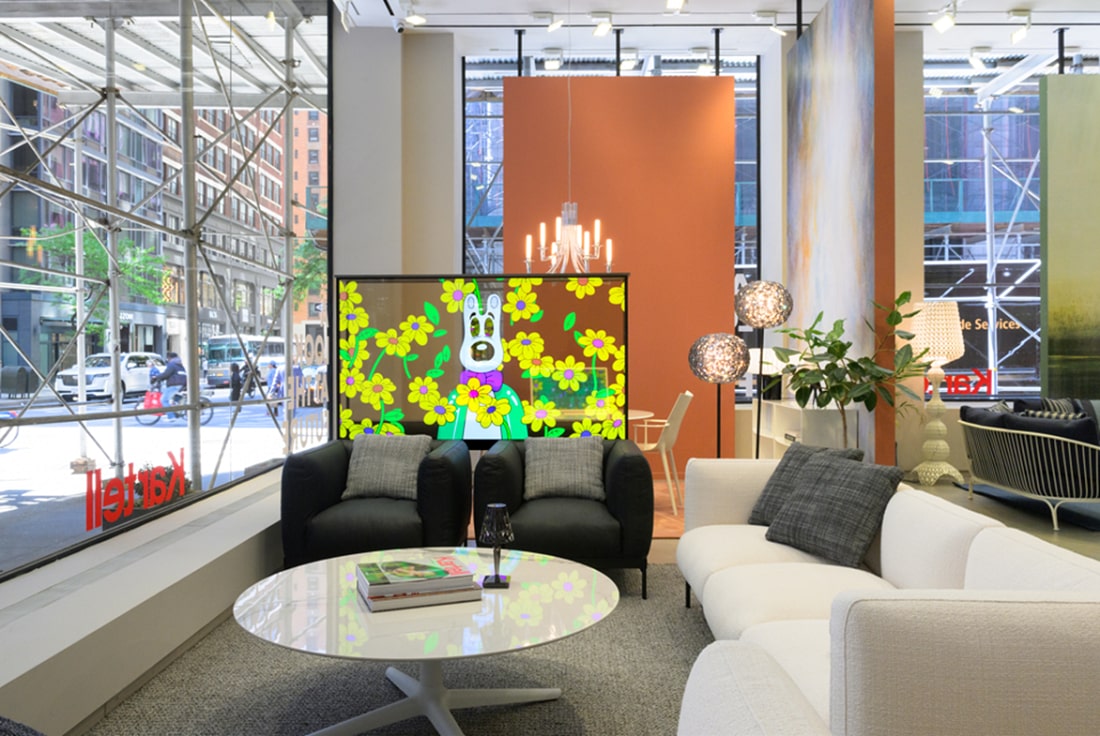 To demonstrate how its screens can be effortlessly integrated into home décor, the transparent OLED T model was placed in the center of Kartell’s modern furniture, designed for various living solutions, enhancing the openness of the showroom. Its see-through screen can also be placed in front of a window, allowing natural light to flow into the space without obstructing the view.