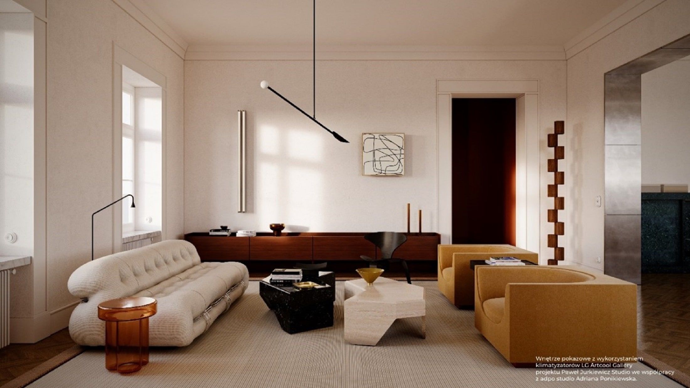 “My dedicated tenement interior presents the aesthetic values of the LG ARTCOOL Gallery air conditioner. Its ambiance was curated to show how even technical elements, like an air conditioner, can blend into a classic apartment with ease,” said interior designer Paweł Jurkiewicz. “Thanks to its technical properties, the air conditioner can hang as low as 150 centimeters above the floor, like a picture frame, which served as the inspiration for the LG ARTCOOL Gallery model. A typically masked device has become a decorative element, giving designers the freedom to choose its perfect location. On one hand, the air conditioner promises efficient operation, while on the other, users need not worry about it visually disturbing the décor’s harmony.”