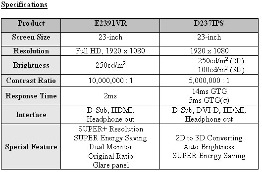“These monitors aren’t just for work and internet browsing, they were designed to be the center of entertainment for any bedroom, study or dormitory,” said Havis Kwon, President and CEO of LG Electronics Home Entertainment Company. “The E2391VR and D237IPS combine elegant design and unique technology to look great in any room and still be able to deliver exceptional images and videos.”