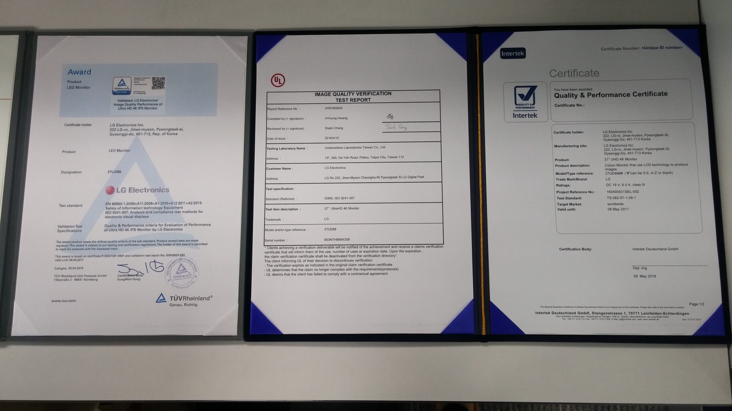 SEOUL, May 13, 2016 — LG’s all-new 27-inch 4K Ultra HD USB-C monitor (model 27UD88), with its excellent picture quality and usability features, was recognized by some of the worlds’ most discerning testing facilities for its high professional standards for color accuracy, image resolution and productivity-boosting features. Organizations such as Intertek, TUV, UL and VESA have all certified or validated the LG 27UD88 as meeting their highest standards of monitor quality and performance.