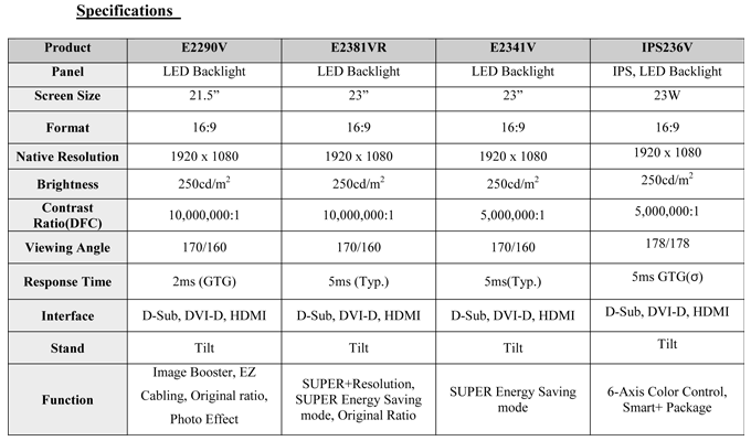 Each monitor in the SUPER LED series incorporates energy efficiency. The E2341V series uses SUPER Energy Saving technology, so it consumes less energy than conventional LED monitors with no drop in picture quality. Other SUPER LED series are up to 40 percent more energy efficient than standard LCD units.