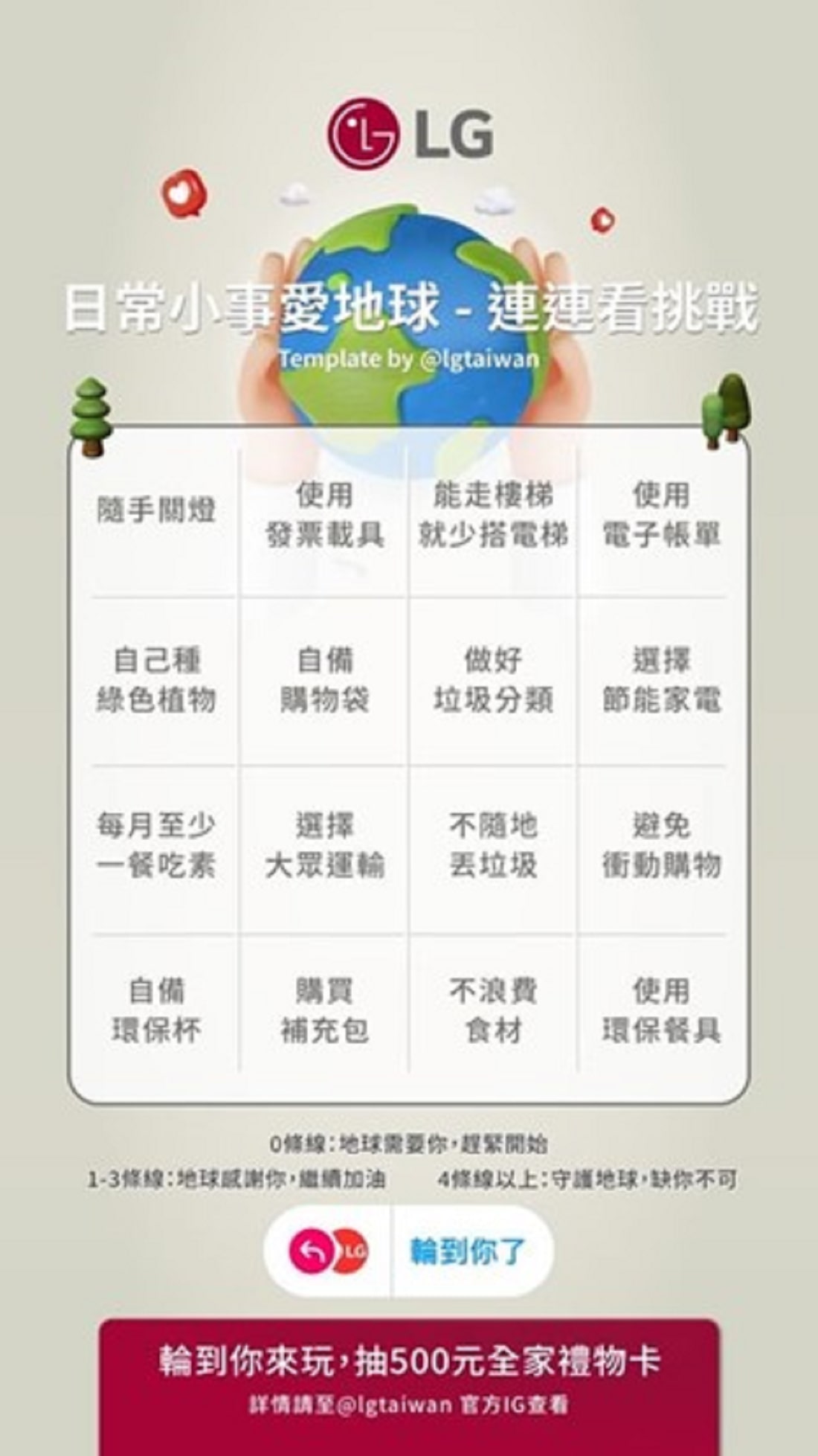 To highlight this message, LG Taiwan unveiled a challenge on its official social media page, inviting users to reshare their Instagram story template, selecting what good things ā no matter how big or small ā they do to show that they love the earth! Running from April 22 to May 5, the company will select six winners who will receive a gift card.