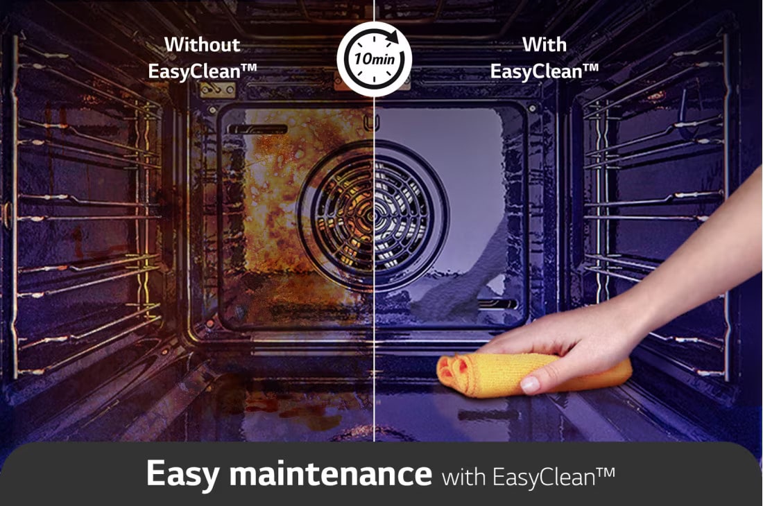 Παράλληλα, η LG δίνει ιδιαίτερη έμφαση στην ευκολία καθαρισμού. Η λειτουργία Easy Clean1 επιτρέπει τον γρήγορο καθαρισμό του εσωτερικού με τη χρήση ατμού, χωρίς έντονα χημικά, χαλαρώνοντας τα υπολείμματα λίπους και φαγητού σε λίγα μόλις λεπτά. Επιπλέον, η πυρόλυση2 προσφέρει βαθύ καθαρισμό, καίγοντας τα υπολείμματα σε υψηλές θερμοκρασίες και μετατρέποντάς τα σε στάχτη που απομακρύνεται εύκολα, διατηρώντας τον φούρνο σαν καινούριο.