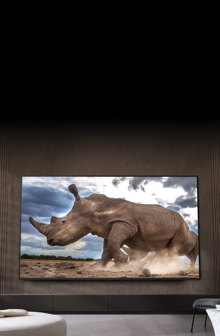 A rhinoceros in a safari setting is shown on an Ultra Big LG TV, mounted on the brown wall of a living room surrounded by cream-colored modular furniture.