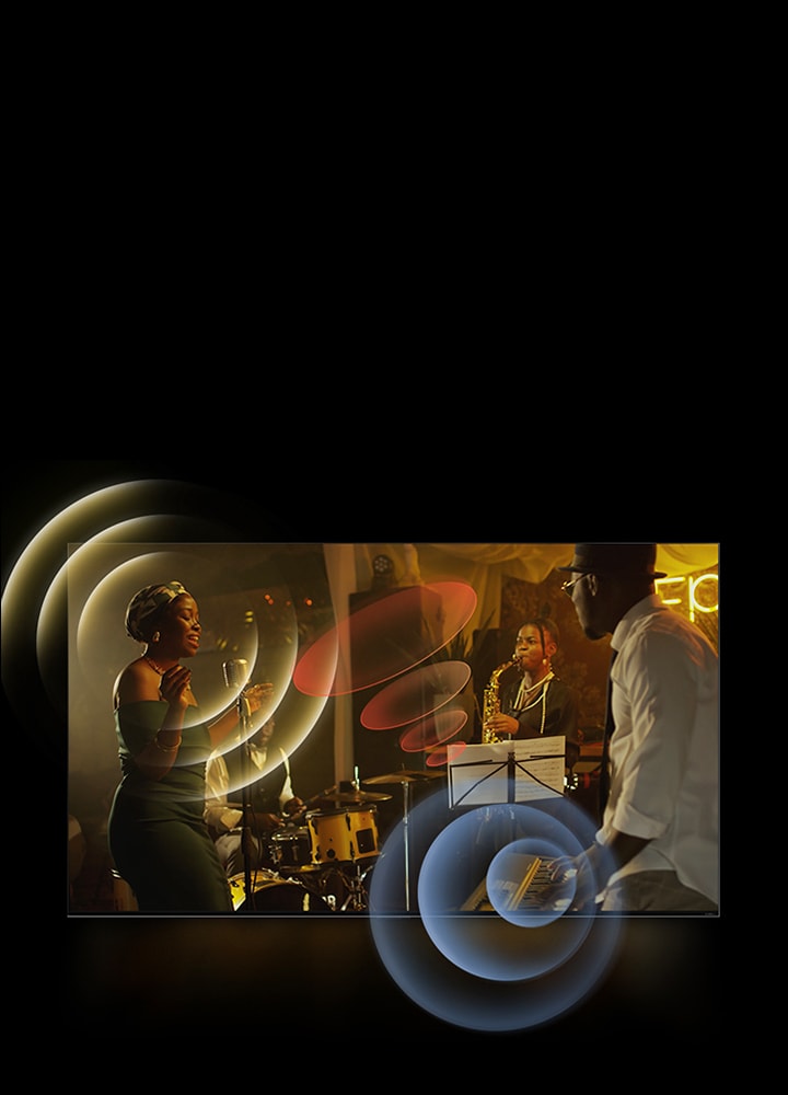 LG TV mounted on a wall in a living room with a guitar player shown on the screen. Concentric circle graphics representing sound waves.