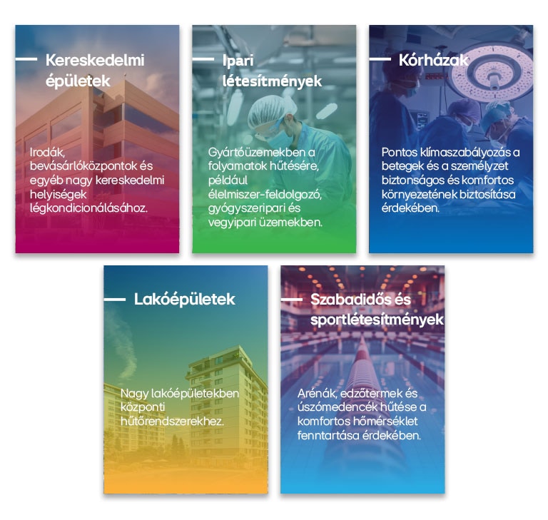 Hűtési megoldások épületek, ipari létesítmények, kórházak, lakóparkok és szabadidős sportlétesítmények számára.