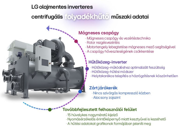 Hatékony HVAC hűtés, LG olajmentes centrifugális folyadékhűtő, mágneses csapágy, inverteres technológia.