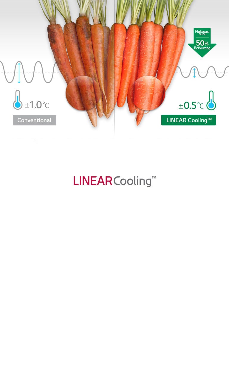 Suhu yang stabil dan merata menjadi kunci menjaga kesegaran makanan. Linear Cooling™ mempertahankan suhu di dalam lemari es dengan fluktuasi hanya di kisaran /- 0.5°C