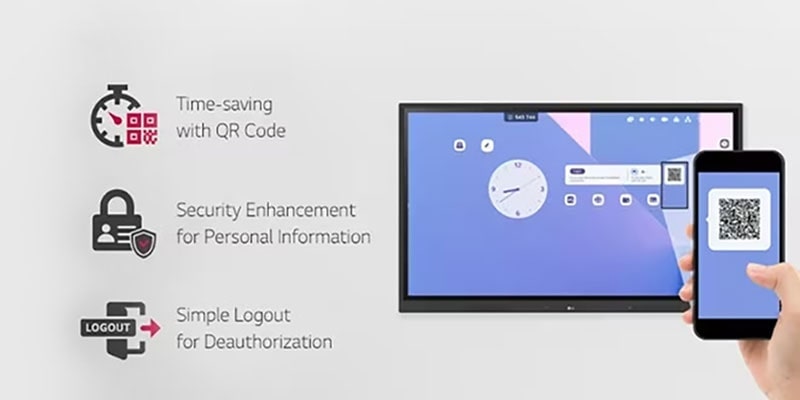 The QR code on the home screen reduces preparation time for class by enabling personal device verification. Users can sign up for a variety of apps on the LG CreateBoard including Google Drive and OneDrive with just one QR verification without any additional login process. Once a lesson is finished, users can simply click the Logout button to disconnect, thus the risk of a personal information leak is reduced.