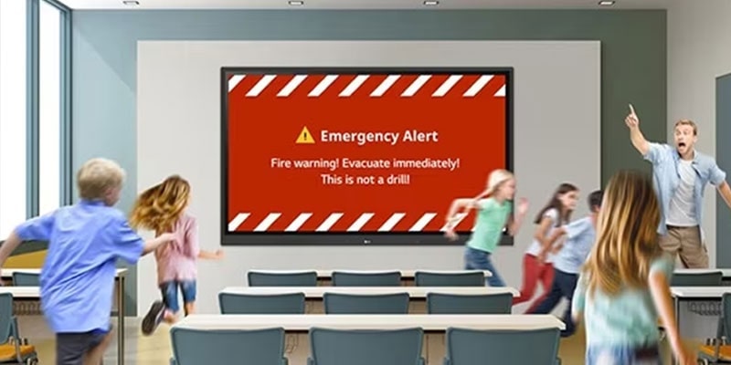 In case of emergency situations such as a fire or a natural disaster, emergency warning alerts will be sent from the main system, which help teachers and students promptly take safety action. When the message is sent out to the device, LG CreateBoard interrupts the current display and sends out emergency messages along with warning sounds.