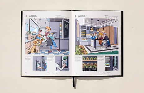 The family is sitting on the couch laughing. Around them are white line-drawing of refrigerator, washing machine, and air conditioner.